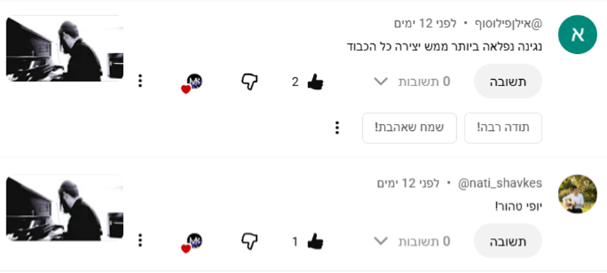 בנוסף התחלתי השנה להעלות גם תיעודי וידאו, מרגעים טובים שהיו לי בנגינה על הפסנתר עם חברים.