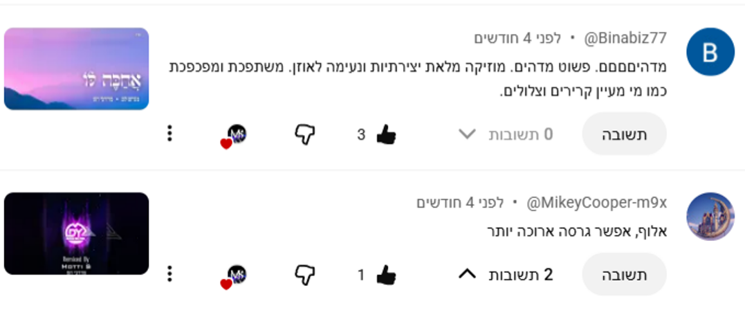 ויש את החלק השני של המוזיקה שלי. זה שכבר יצא החוצה. הצלילים שכבר לא נשמעים רק בשני אוזניי, אלא מקבלים מעכשיו גם את ההקשבה של מאזינים אחרים, כאן יש גם מדד של צפיות / האזנות, וכאן אני מקבל משוב על כל תוכן שאני מוציא, על ידי התגובות, על ידי מספר הצפיות והלייקים, כאן כל שיר והפקה שלי מקבלים אצלי משמעות נוספת.מה גורם לי להחליט להעלות משהו לערוץ?